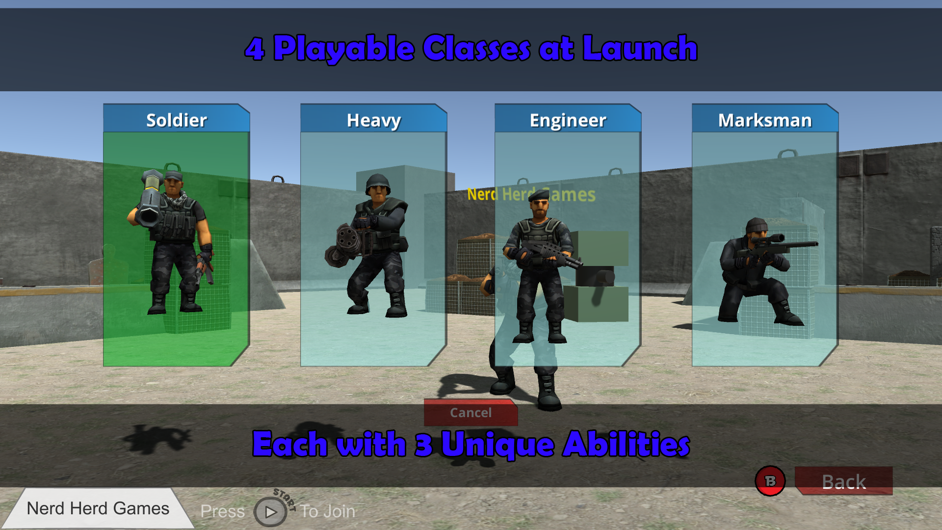 Before each match, players choose from 4 character classes to play as for the duration of the match. The four classes are: Soldier, Heavy, Engineer, and Marksman. Each class it's own unique base stats, 3 abilites to choose from, and unique primary weapons.