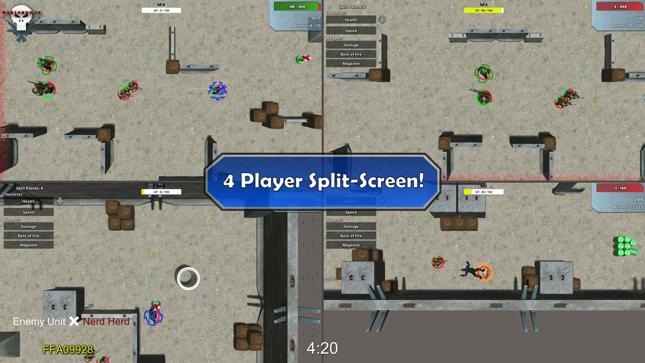 Too few of today's games lack one of the most important features that made games as popular as they are today; Split-Screen Gameplay! In Warlords.IO, players can have up to 4 players split-screen in most versus modes and all cooperative modes. Fight along side your friends on your couch in palm sweating co-operative modes that force you to play as a team, or trash talk your way to victory in versus modes.