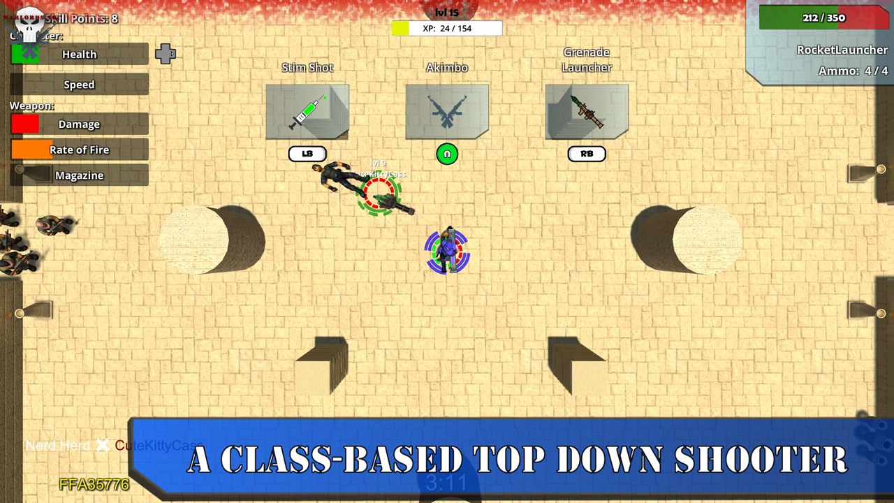 a Cross-Platform Top-Down-Shooter with MOBA like elments and class-based warfare. Players can fight together or against each other in numerous arenas on PC. Versus modes feature short action-packed rounds that give you that beloved "one more" feel.