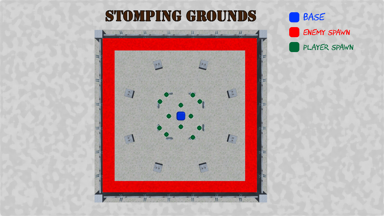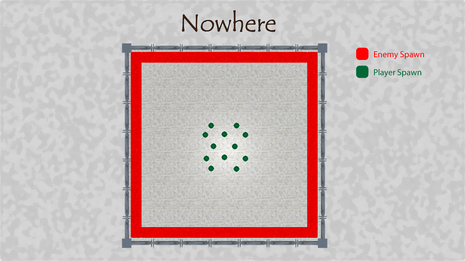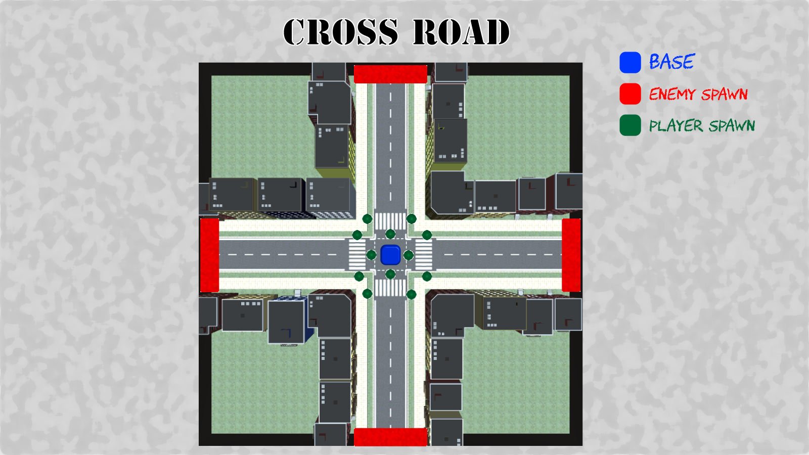 Crossroad lacks virtually any form of cover forcing players to rely soley on skill and reflexes to survive. Crossroad only has one large base for players to defend in the center and enemies can only come from 1 of 4 directions, with no cover to protect them either. Teams will have to work together to keep enemies pushed back and away from the base.